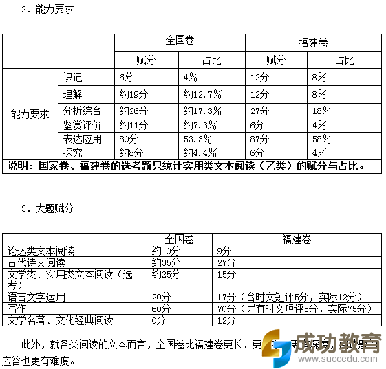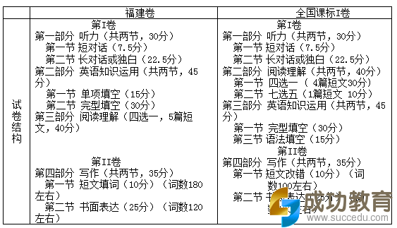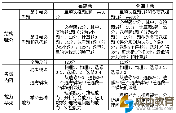 在试卷结构、试题赋分、考试内容、能力要求等方面,福建卷与全国Ⅰ卷稍有差异,详见下表。