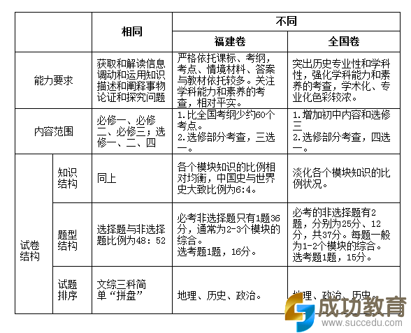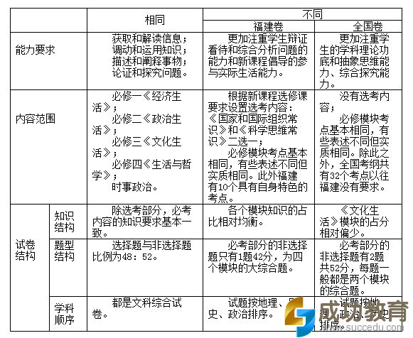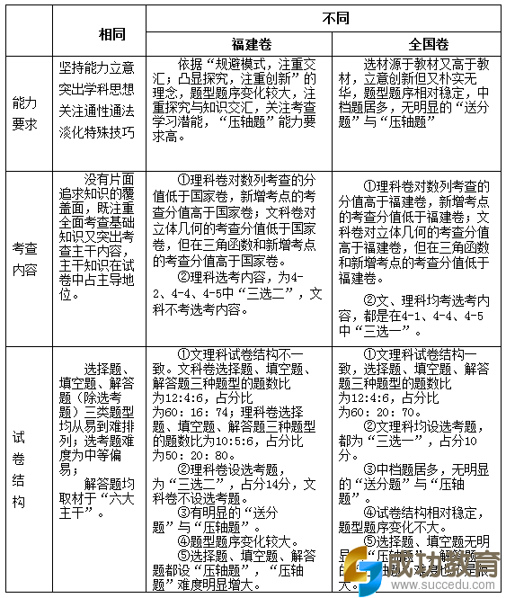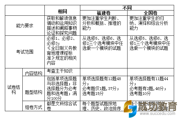 福建卷在能力要求、内容范围、试卷结构等方面,与全国卷稍有差异。具体比较如下: