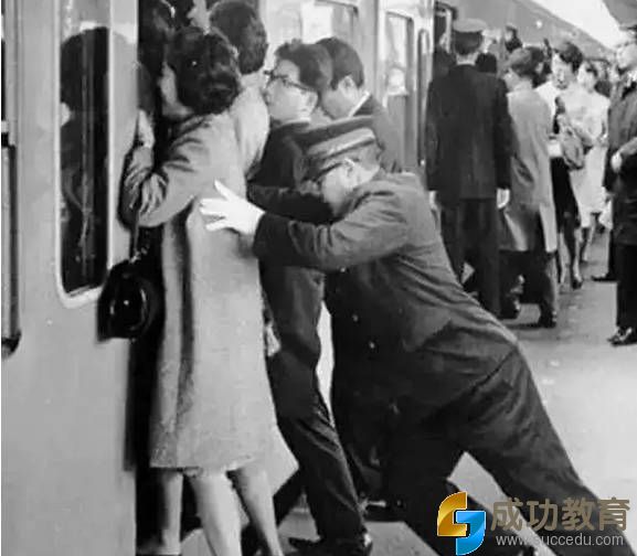 东京地铁在高峰时段,车厢中的乘客会超过容载量的200%,地铁车门都难以关上。这时,就需要地铁“推手”及时出现,把人“塞入”车厢。