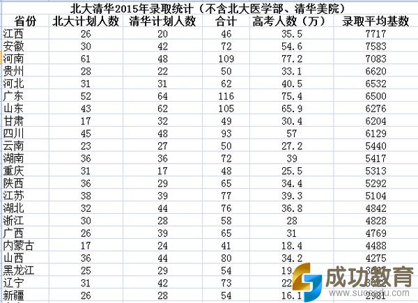 北大、清华本科招生类型有很多种,除北大医学部、清华美院单列外,有保送生、自主招生、综合评价招生(北大博雅计划、清华领军计划)、农村学生单独招生(北大筑梦计划、清华自强计划)、国家专项计划招生(贫困地区)、国防生、定向生、小语种招生、飞行员班、高水平艺术团、高水平运动队、少数民族预科班、内地民族班、港澳台学生招生、留学生招生,北大还有第二学士学位招生。2015年北大录取4006名本科新生,清华录取3300多名本科新生,去除以上所列类型招生,统招生源只占两校生源录取总数的三分之一。如果一名考生没有获得保送资格,没有获得自主招生、综合评价招生、农村学生单独招生降分录取资格,没有艺体类特长、不考虑国防生和定向生,又不是832个国家级贫困县的考生,那么他(她)所在省市今年考取北大清华的难度如何呢?