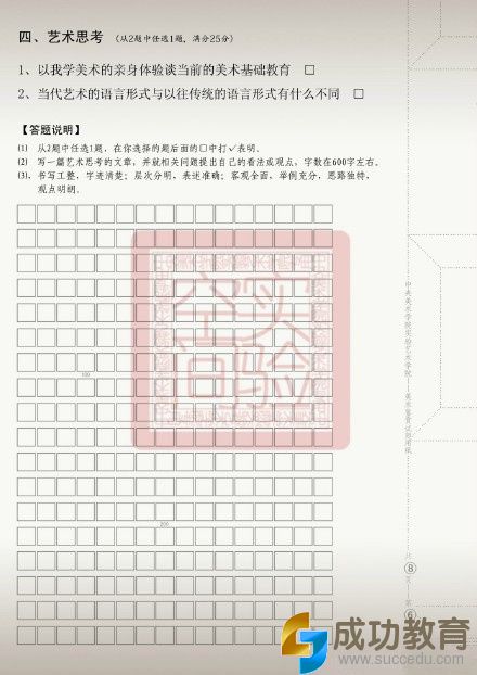 即鉴赏和艺术思考。鉴赏方面,着重考查考生对于经典作品的解读和文字阐述,在考查同学们对基础知识了解的同时更了解其解读美术作品的方法论和角度,特别要注意的是鉴赏题目今年并不是单纯的只对两件作品进行赏析而是强调其之间的对比,这里是体现出考生们的头脑灵活性和比较的着眼点。而艺术思考方面,今年设置了两个题目供考生选择,应该说题目的设置充分照顾到了绝大多数考生的水平,让大家有话可说。例如第一题,“结合自身经历谈美术基础教育”。只要考生结合个人学习历程,有思考,有想法,言之成理,具有真情实感,思路清晰即可得分。而第二题,“当代艺术与传统的关系”则是充分体现出实验艺术学院的自身特点,注重对传统文化和民间文化资源的发掘和借鉴,考生在答题时不仅可以体现出其对这类问题相关实例的了解和知识储备,还可对自己所持的观点进行抒发和阐释,更能展示个人的素养。应当说两个论述题目无论是从“博”的角度还是“专”的角度都是可以让广大考生发挥出实际水平的好题。