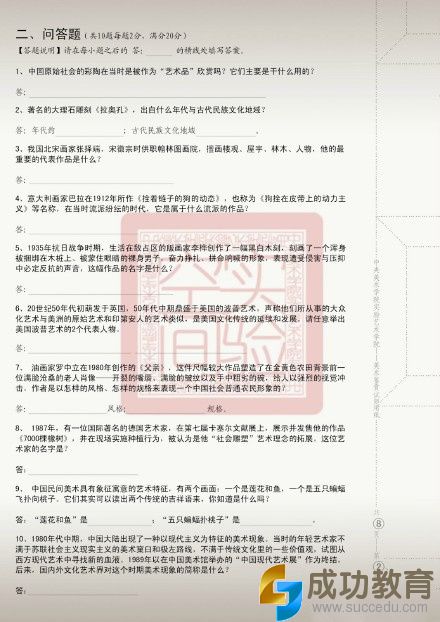 即选择填空和问答,共15道题,侧重于对同学具体美术史知识点和美术理论常识的掌握和了解,对具体作品的年代及所属派别是其出题重点。在出题点上对东西方艺术的早期探究(例如:原始彩陶、红山文化、古希腊艺术等)和现当代艺术的发展历史(“85新潮”、博伊斯、波普等)是其重点。除了书本上的硬性知识点之外出题范围还涵盖了民间美术、现代主义艺术、后现代艺术、中国现当代美术等内容,出题面宽,考察面广。除此之外,在题目形式上采用了一题多空,即对一个美术史知识进行多角度考察,更加注重同学们的美术知识面而不是单纯的对课本知识小点的死记硬背。应该说,这样的出题点体现出了实验艺术的一种出题思路,它要做的不是参考人文学院的美术史考察办法对考生进行通史性的知识考察,而是结合实验艺术的特点有针对的选择。