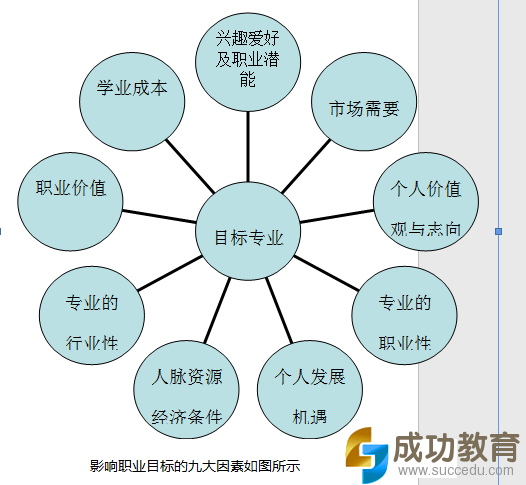我们可以看到,影响学业目标选择的因素包括了职业价值、个人价值观、市场需要、个人的兴趣爱好及潜能、家庭背景及人脉资源经济条件、学业成本、专业的职业性、专业的行业性、发展机遇等九个方面的因素,下面我们一一来进行解析: