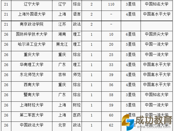 1977年我国恢复高考38 年来,代表中国高等教育最高水平的中国六星级大学最受全国高考状元青睐,9成状元选择就读北大清华港大等中国六星级大学;上榜的中国五星级大学数量高达 19所,但录取状元数仅占7.53%,对状元吸引力远低于中国六星级大学;四星级和三星级大学近20所,录取状元数仅占2.53%。从上榜高校类型来看, 综合、理工、语言和财经等类名牌大学最受高考状元青睐,综合类有23所,北大、港大最受状元青睐;其次是理工类有7所,清华、中科大最受状元垂青;语言类 有6所,北外、外交学院最受状元喜爱,财经类有3所,对外经贸大、上海财大最受状元欢迎。