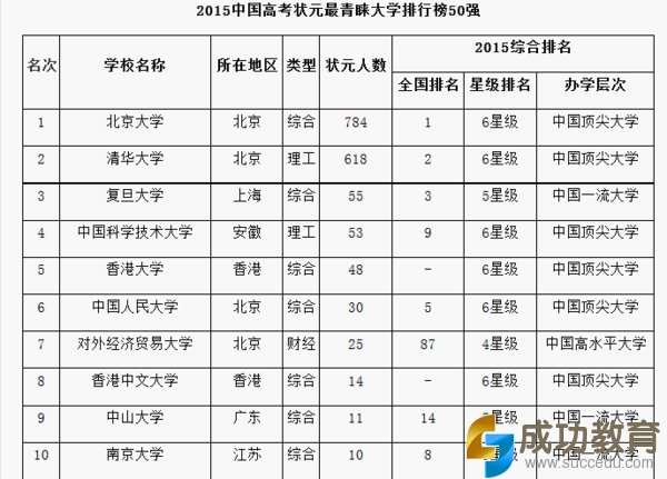 报告显示,在艾瑞深中国校友会网最新调查的1977-2014年中国各地区省级高考状元中,北京大学最受全国高考状元青睐,选择就读的状元有784 人,雄居艾瑞深中国校友会网2015中国高考状元最青睐大学排行榜50强榜首,连续9年蝉联全国冠军;清华大学屈居第二,选择就读的状元有618人;恢复高考38年来,两校共录取了全国各省市区1400多高考状元, 占总数的80.62%,两校拥有两岸四地其它名牌大学望尘莫及的社会认可度和影响力,是中国最受高考状元青睐的大学。复旦大学有55人,位居第三;中国科 学技术大学有53人,列第四;香港大学有48人,居第五;中国人民大学有30人,名列第六;对外经济贸易大学有25人,居第七;香港中文大学有14人,居 第八;中山大学有11人,列第九;香港科技大学和南京大学各有10人,并列第十。