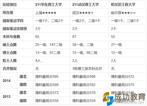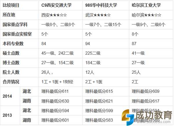 下面我们选取一所C9院校、一所985院校,在实力和分数上进行比较。从办学规模上来说,哈工大是2所工科院校合并,以工科为主,华科是3校合并,2所工科、一所大名鼎鼎的医科,西安交大也是3校合并,1所工科、1所医科、1所财经院校。虽然院校规模不如另外2校,但是我们从国家重点学科、国家重点实验室、博士点、硕士点、院士人数等来看,哈工大还略胜于其它2校,而我们从2013年、2014年的湖南、湖北省的录取分数来看,哈工大分数是最低的,少则低几分,多则低十几分甚至达到二十分,单从湖南、湖北2省的情况来看,哈工大的性价比是超高的,不论和C9成员的西安交大比还是和985院校的华中科大比,所以不但湖南、湖北的同学需要高度关注一下哈工大,其它南方省份的同学一样不可错过这样一所性价比超值的高水平大学。