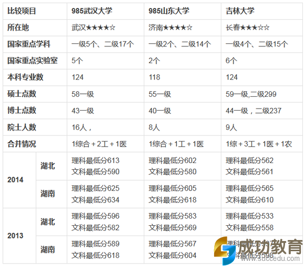 下面将吉林大学与其它2所985综合大学进行比较,来说明它的性价比之高。在比较中我们可以看到,武汉大学、山东大学、吉林大学的各项指标都在伯仲之间,而论规模吉林大学最大,所以相对来说吉林大学稍显逊色,但是相差不大,但是从分数所来看,理科最多的相差五六十分,这已经不是一个档次的学校相差的分数了,而实际确实是一个档次的学校,文科相对分数所差少一些,但是也达到了二三十分。所以湖南、湖北分数不是特别高的同学,一定要关注这所985名校,以211的分数读985,性价比超值。除两湖以为其它省份的同学也要关注哦。值得注意的是,虽然吉林大学录取分数线不高,是因为吉林大学学科比较多,其中不乏像农林类、地矿类专业,因为人们一直对这些专业怀有成见,再加上吉林大学自身及地域原因,导致一些专业分数不高,但是一些热门、有实力的专业,分数还是很高的。
