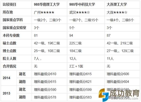 我们选取同是“四大工学院”的华中科技大学和华南理工大学进行比较,从比较中我们看出,各项指标华中科技大学最强,但是它是原四大工学院的华南工学院合并了2所学校,特别是大名鼎鼎的同济医科大学,所以各项指标领先很正常,而大连理工大学和华南理工大学没有合并学校,所以总体来说实力相当,我们再看2013、2014两年在两湖理工科的录取分数,另外2校少则高大连理工大学四五分,多则高十四五分,所以在水平差不多的高校中,大连理工大学是分数稍低同学的选择,另外随着对大连市的认知度越来越高,大连理工大学的分数也会慢慢水涨船高。