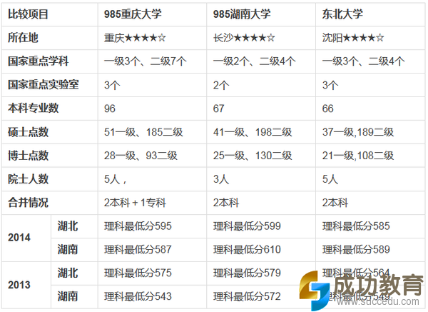 我们同样选择2所985以理工见长的大学和东北大学进行比较,从比较中我们可以看到,湖南大学、重庆大学的实力水平与东北大学旗鼓相当,但是在分数上重庆大学2013年在湖南分数低于东北大学6分,2014低于东北大学2分,其余全部高于东北大学,高出的分数少则十分左右,多则达到二十分。所以东北大学还是有一定分数优势的,请同学们多多关注。