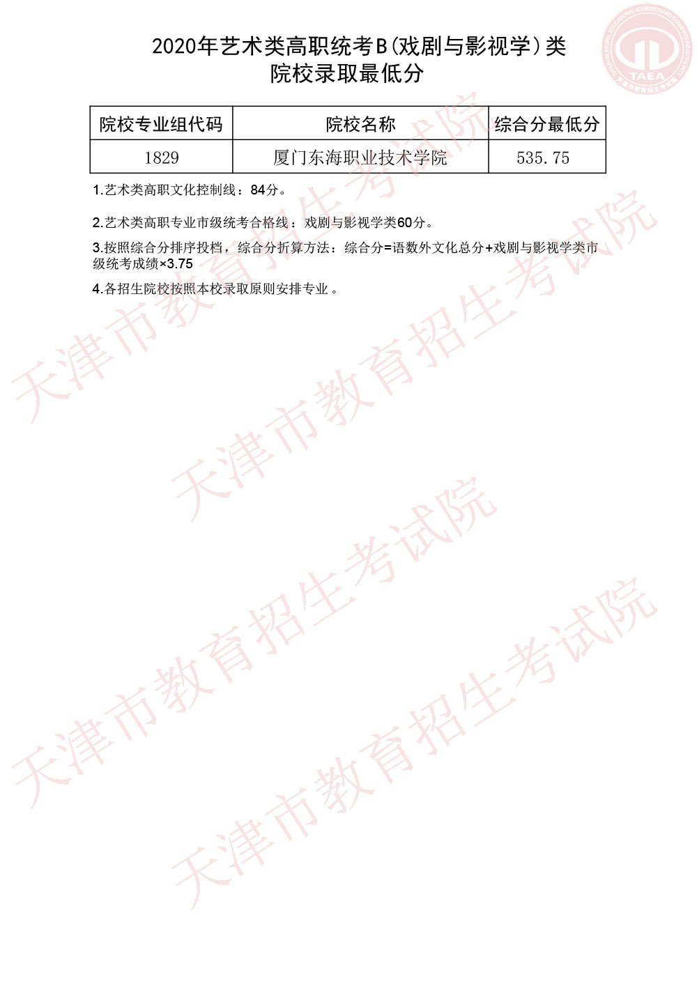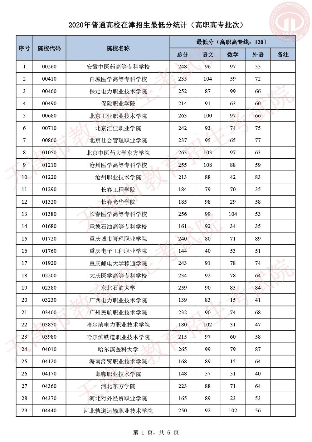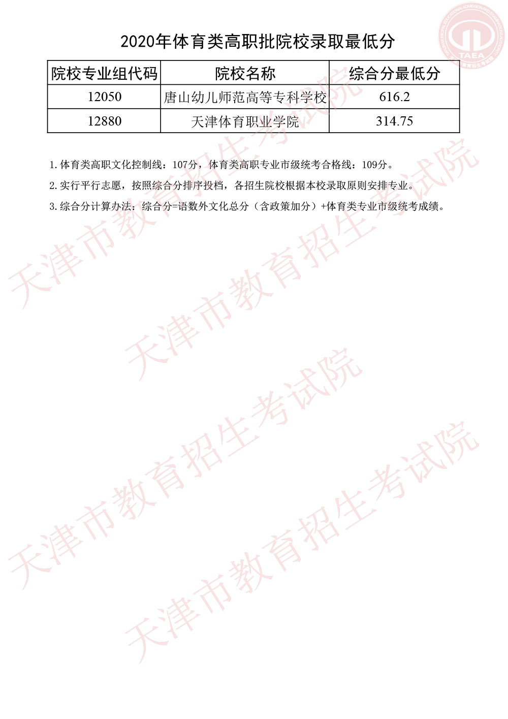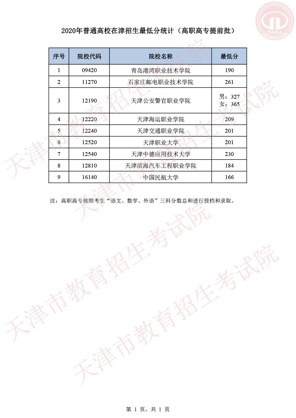 2020年天津市普通高考高职(专科)批次各院校录取最低分