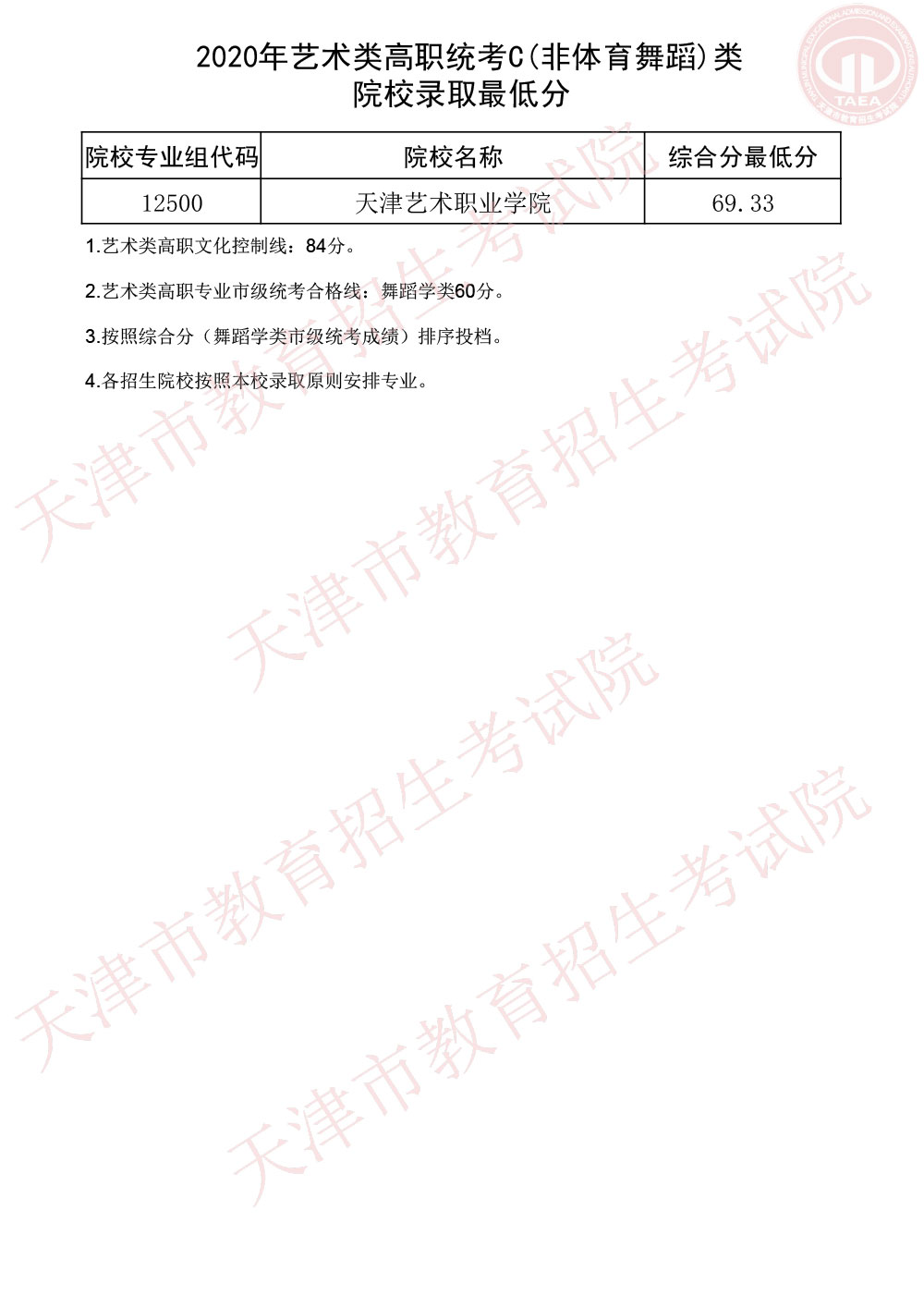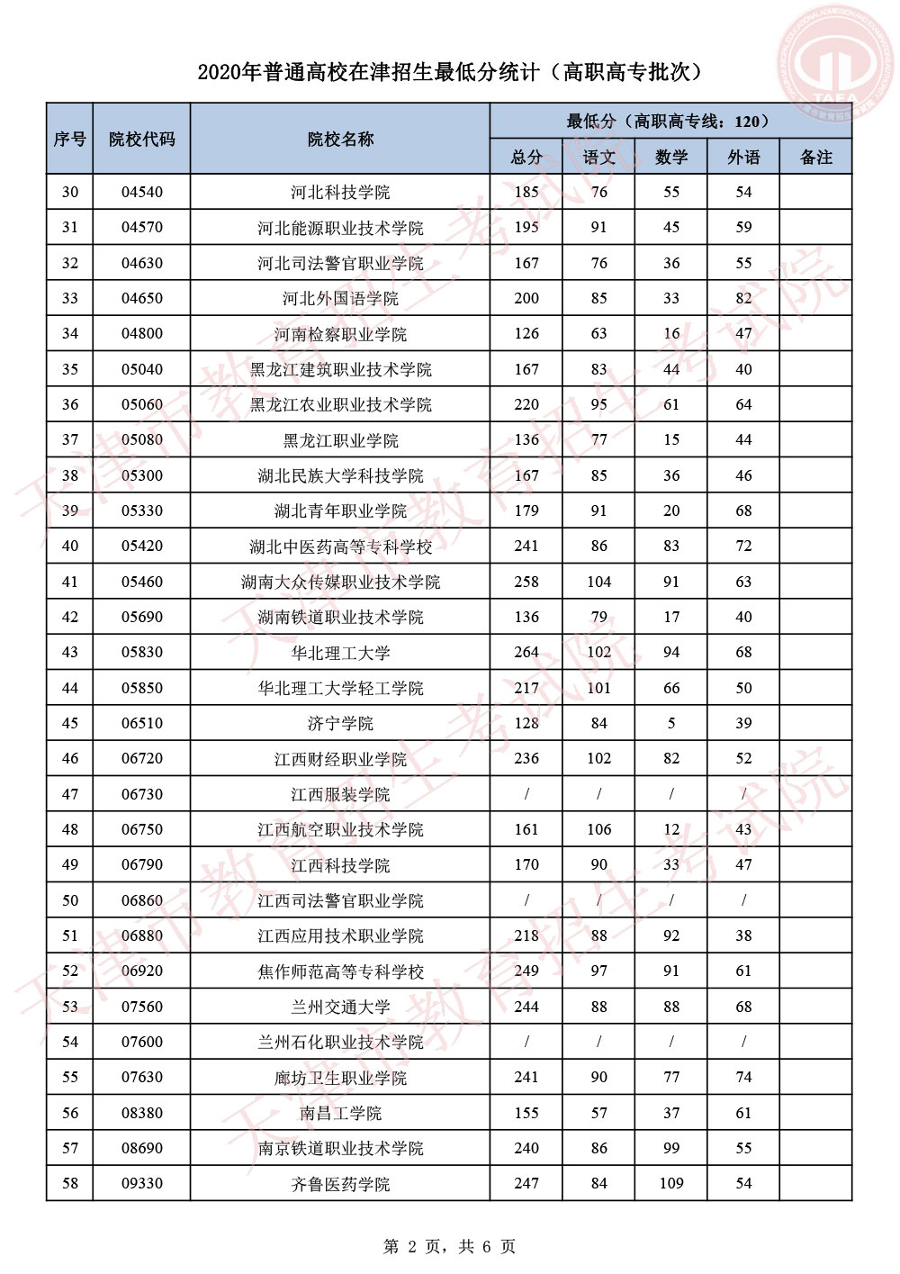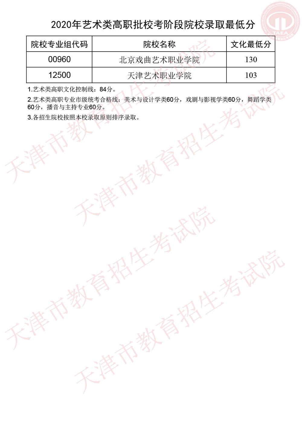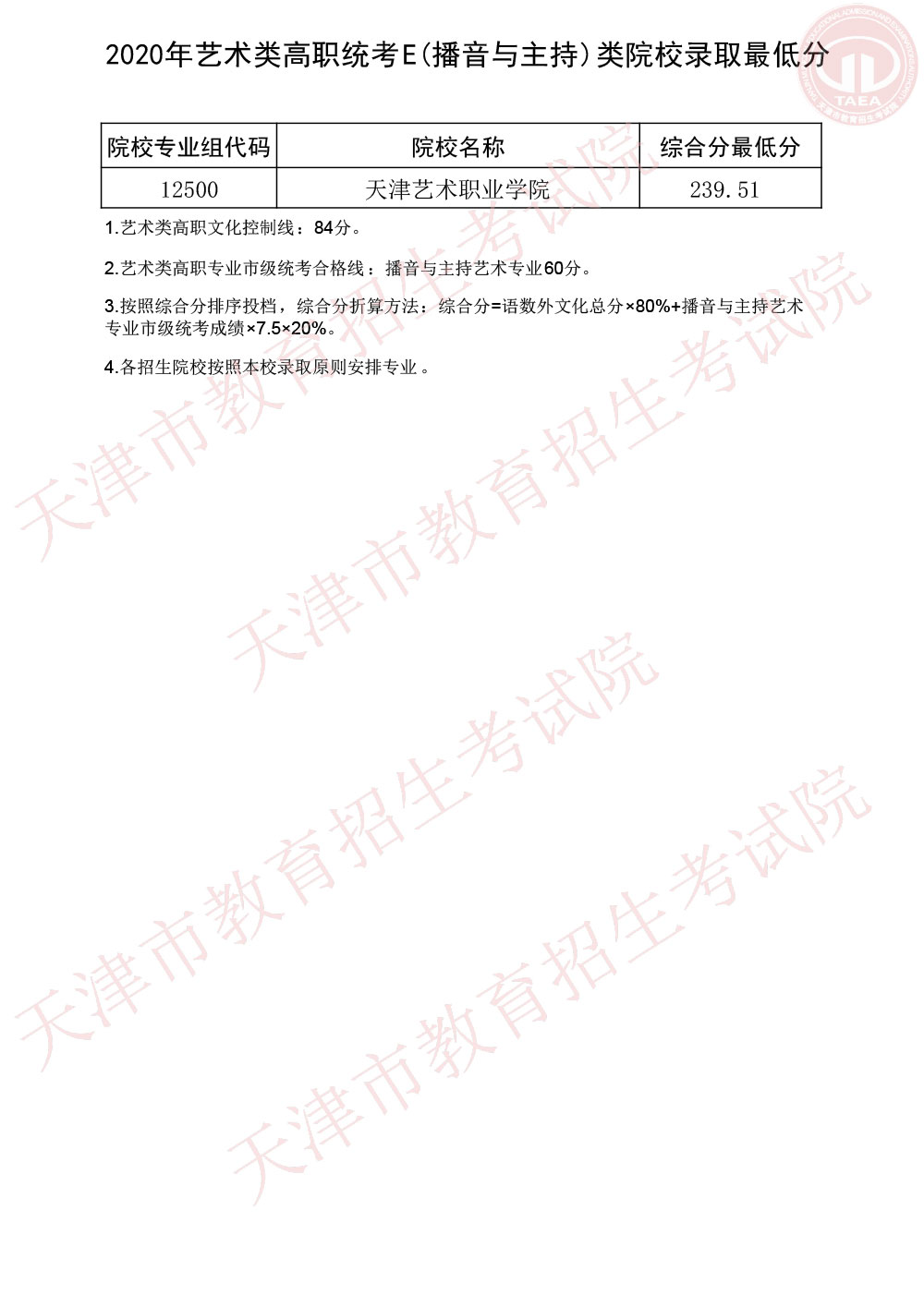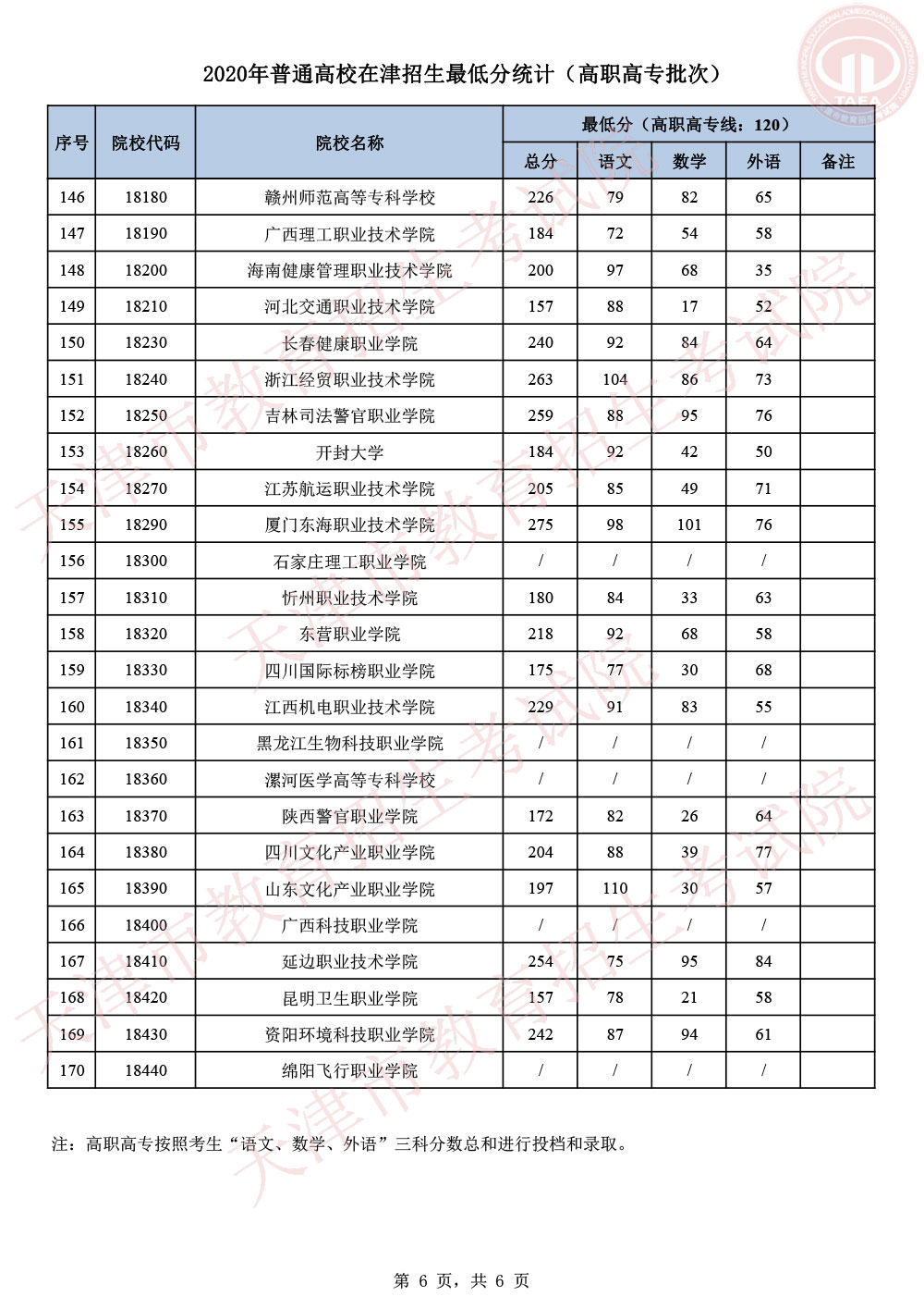 2020年天津市普通高考高职(专科)批次各院校录取最低分