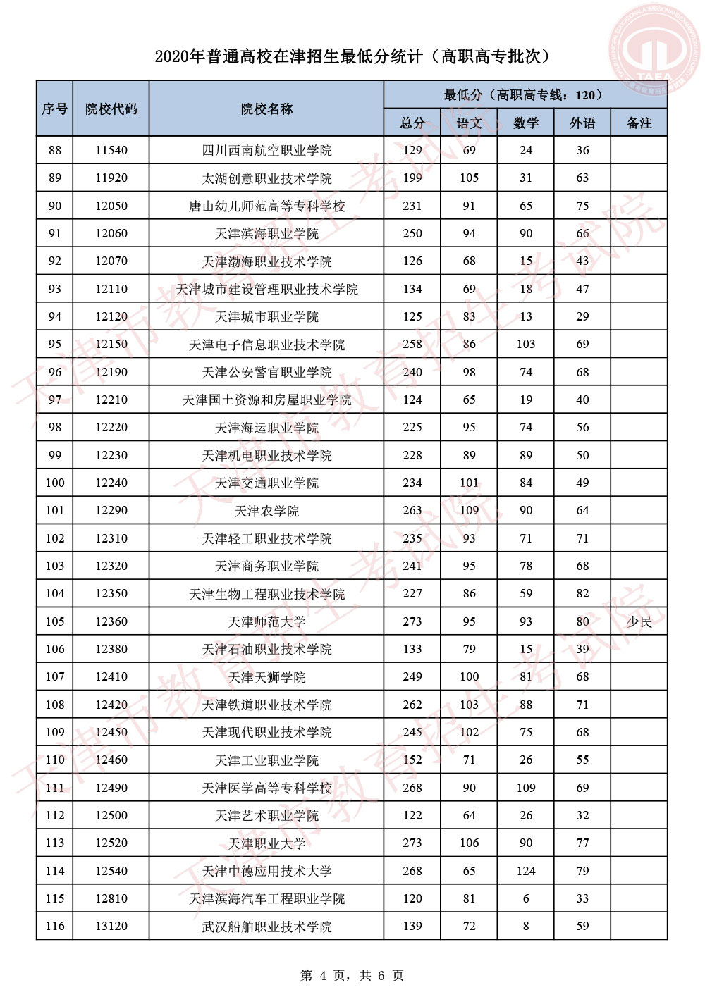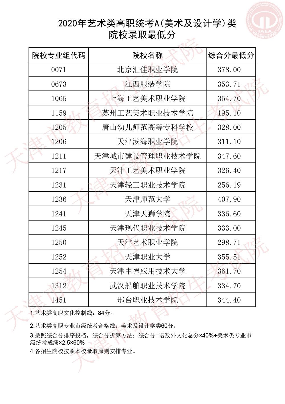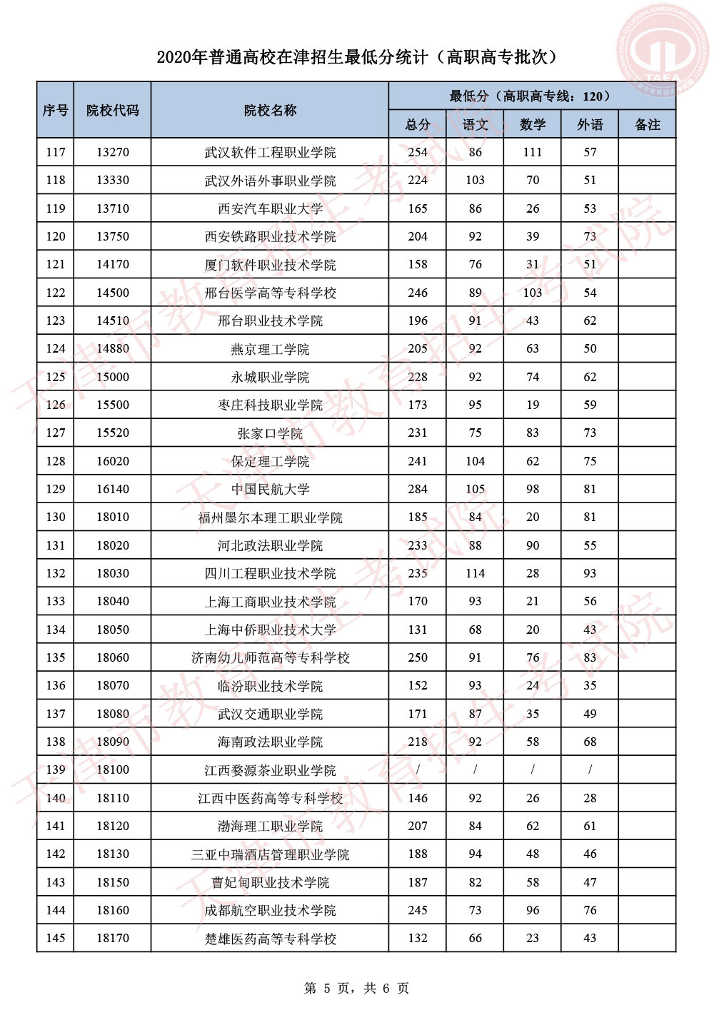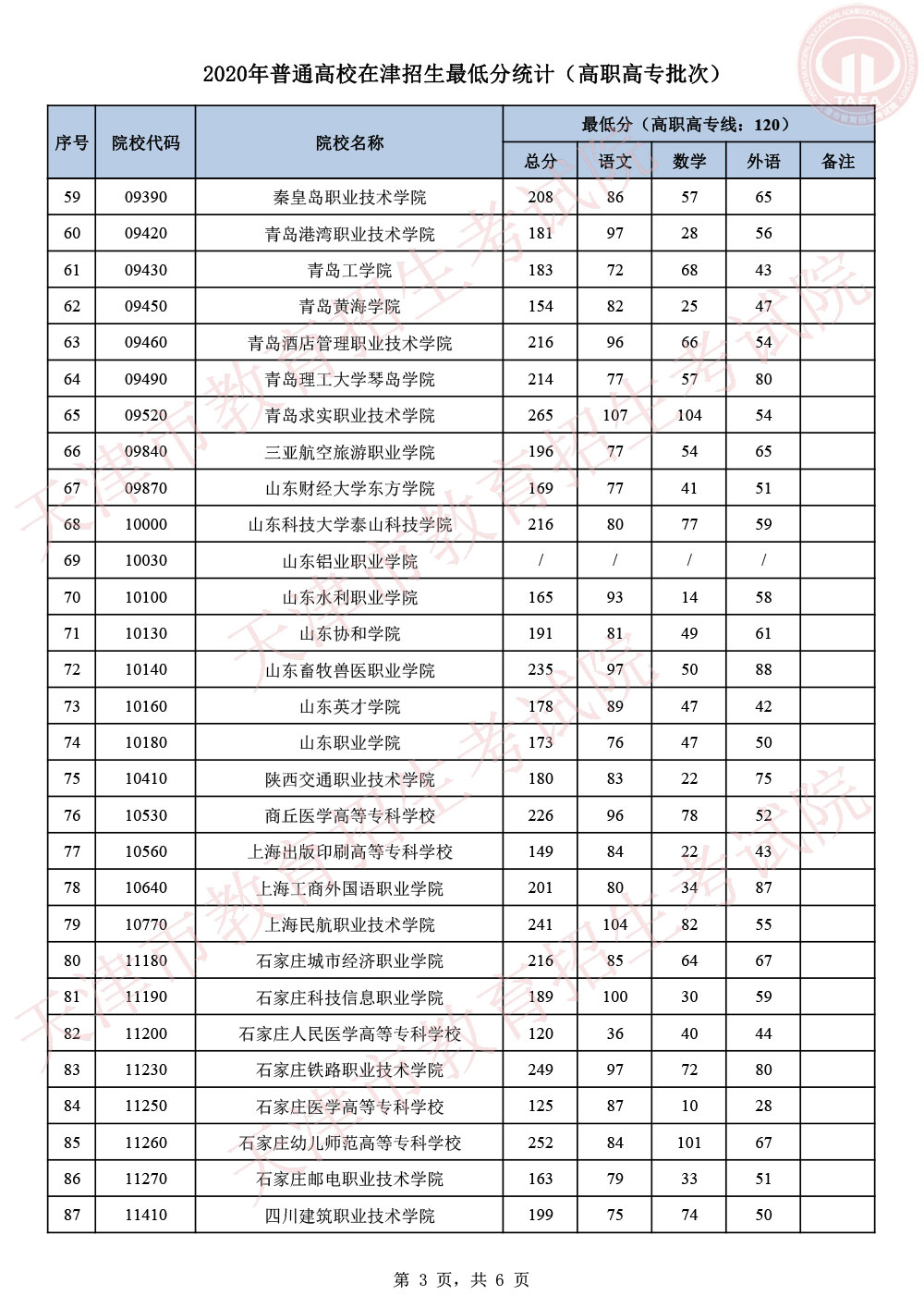2020年天津市普通高考高职(专科)批次各院校录取最低分
