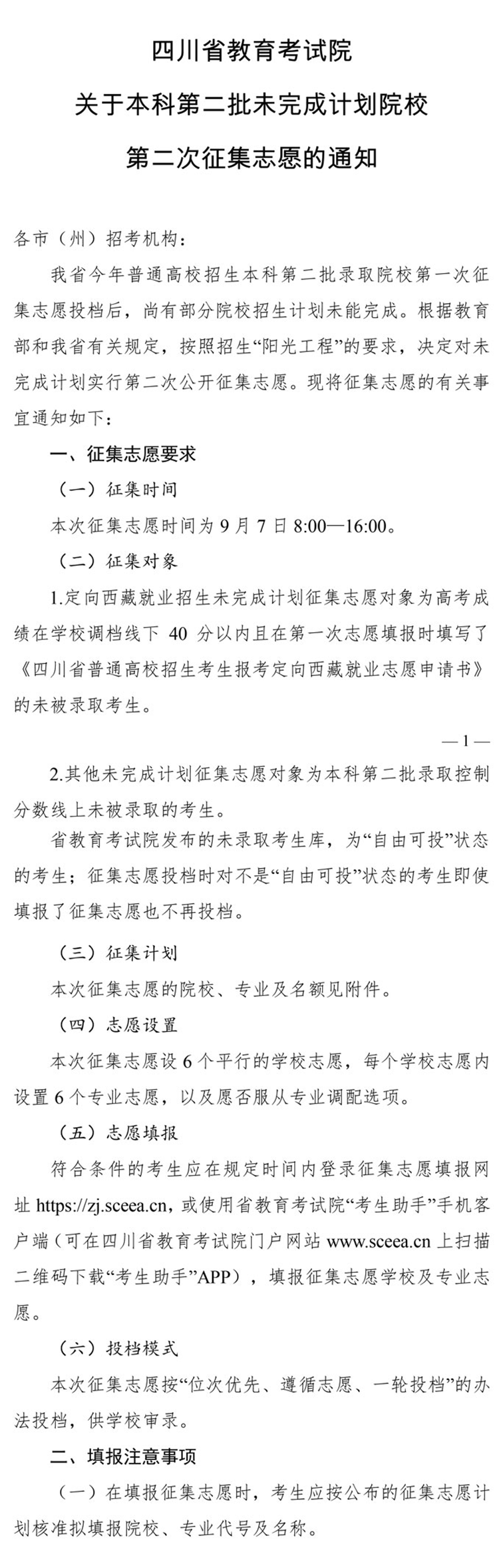 四川:关于本科二批未完成计划院校第二次征集志愿的通知
