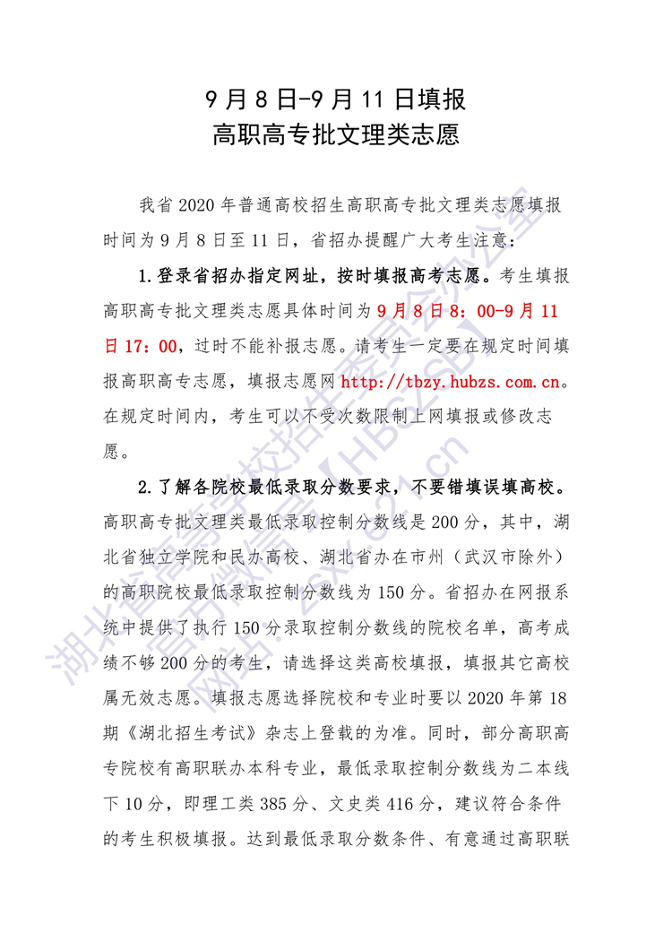 湖北:9月8日-9月11日填报高职高专批文理类志愿