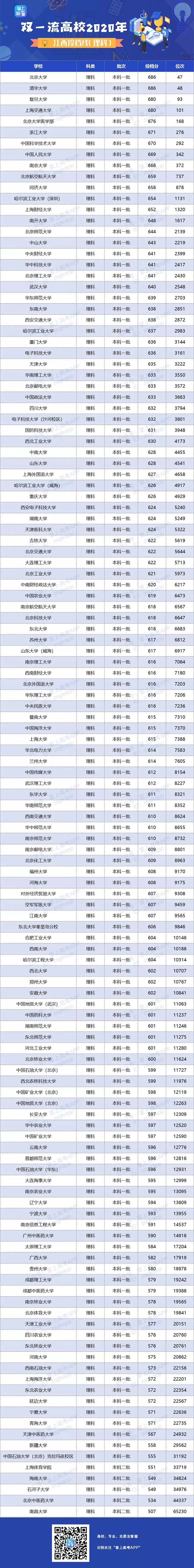 2020年双一流大学在江西投档分数线及位次