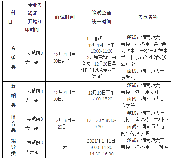 湖南2021年艺考省统考考试时间及 考点安排公布