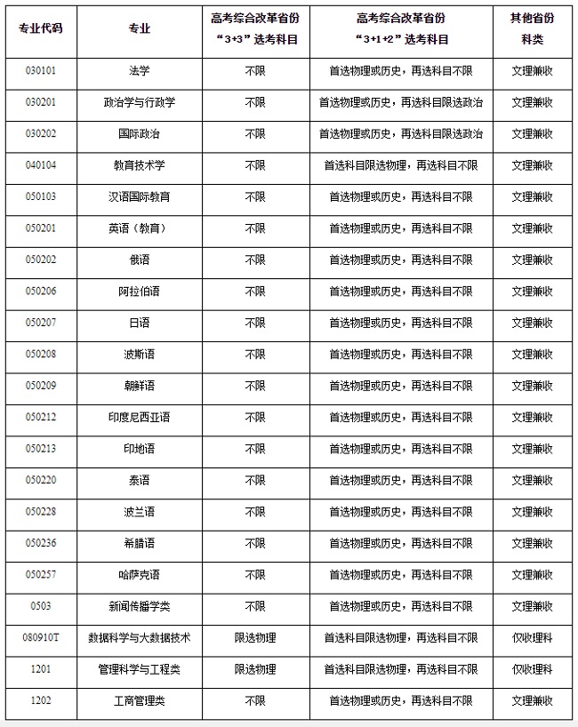 上海外国语大学2021年高校专项招生计划数以教育部核定的高校专项计划招生规模为准,学校将制定分省计划(具体原则见下文第四条)。招生专业目录及选考科目、科类要求如下: