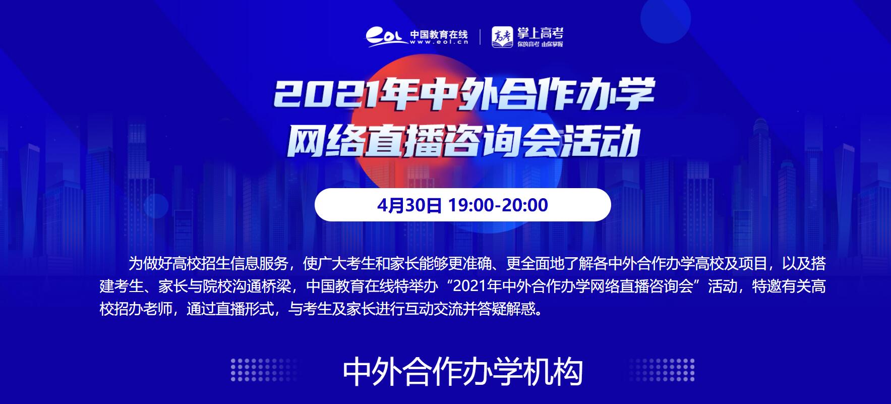 4月30日19:00-20:00,请点击参与:2021年中外合作办学网络直播咨询会。