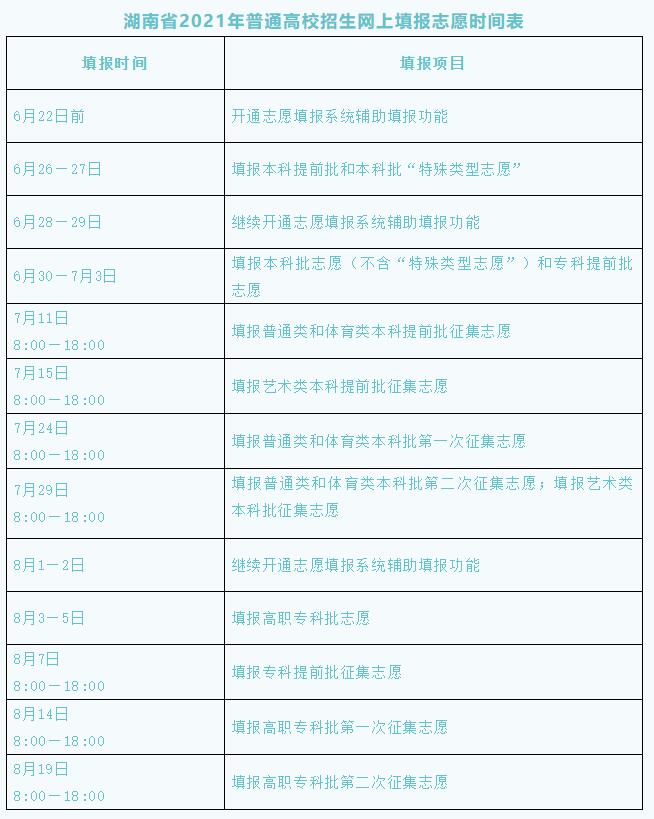 湖南省今年高考成绩和录取控制分数线将于6月25日左右公布。6月22日前开通志愿填报系统辅助填报功能。各批次志愿(含征集志愿)具体填报时间见下表。考生必须在规定的时间内按规定的方式填报志愿(含征集志愿),在填报志愿截止时间之前,考生可在网上填报或修改志愿,逾期则不能补报和修改志愿,也不能放弃志愿。