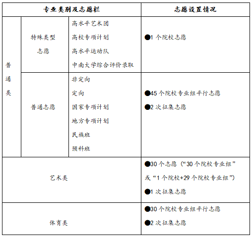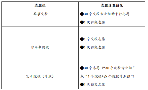 本科提前批设置1个院校志愿;本科批、专科提前批的“定向培养士官”和高职专科批分别设置30个院校专业组平行志愿。