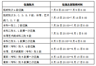 批次:本科提前批(A段、B段、C段、D段、E段、F段、G段);本科一批(H段、I段、J段);本科二批(K段、L段);高职(专科)批(P段、Q段);体育、艺术类本科一批(T段、U段、V段);体育、艺术类本科二批(W段)。