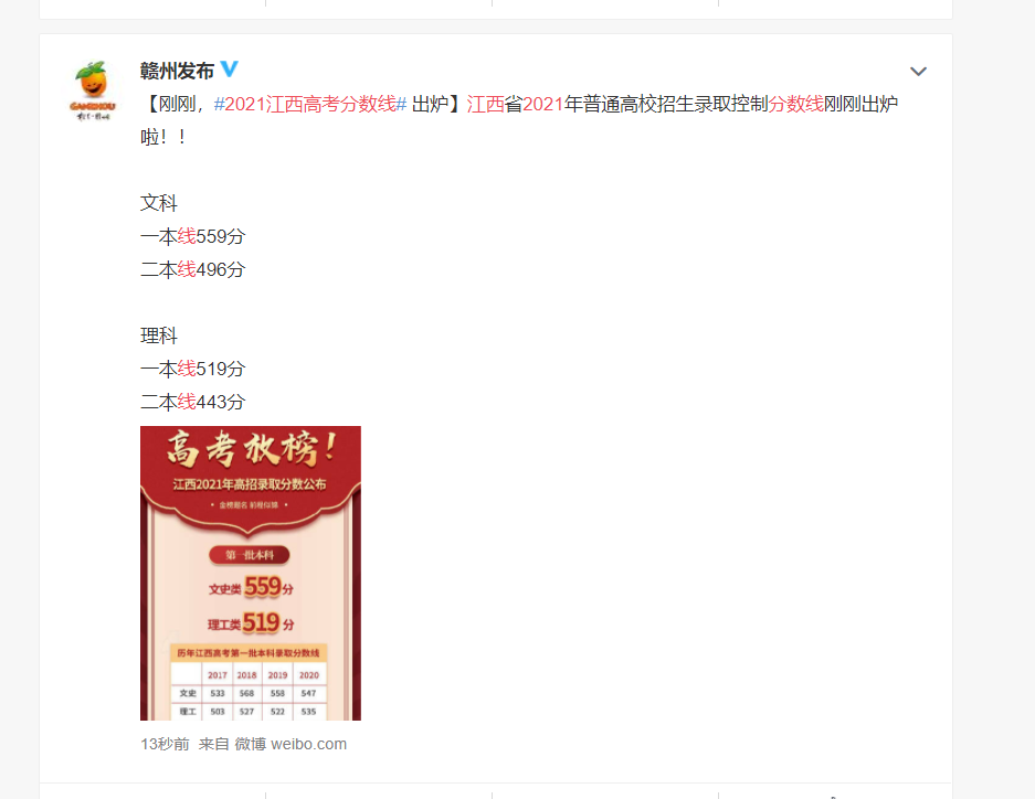江西省2021高考批次线公布,一本文科559,理科519。具体如下:各地高考分数即将陆续公布,查看你的分数能上哪些大学?