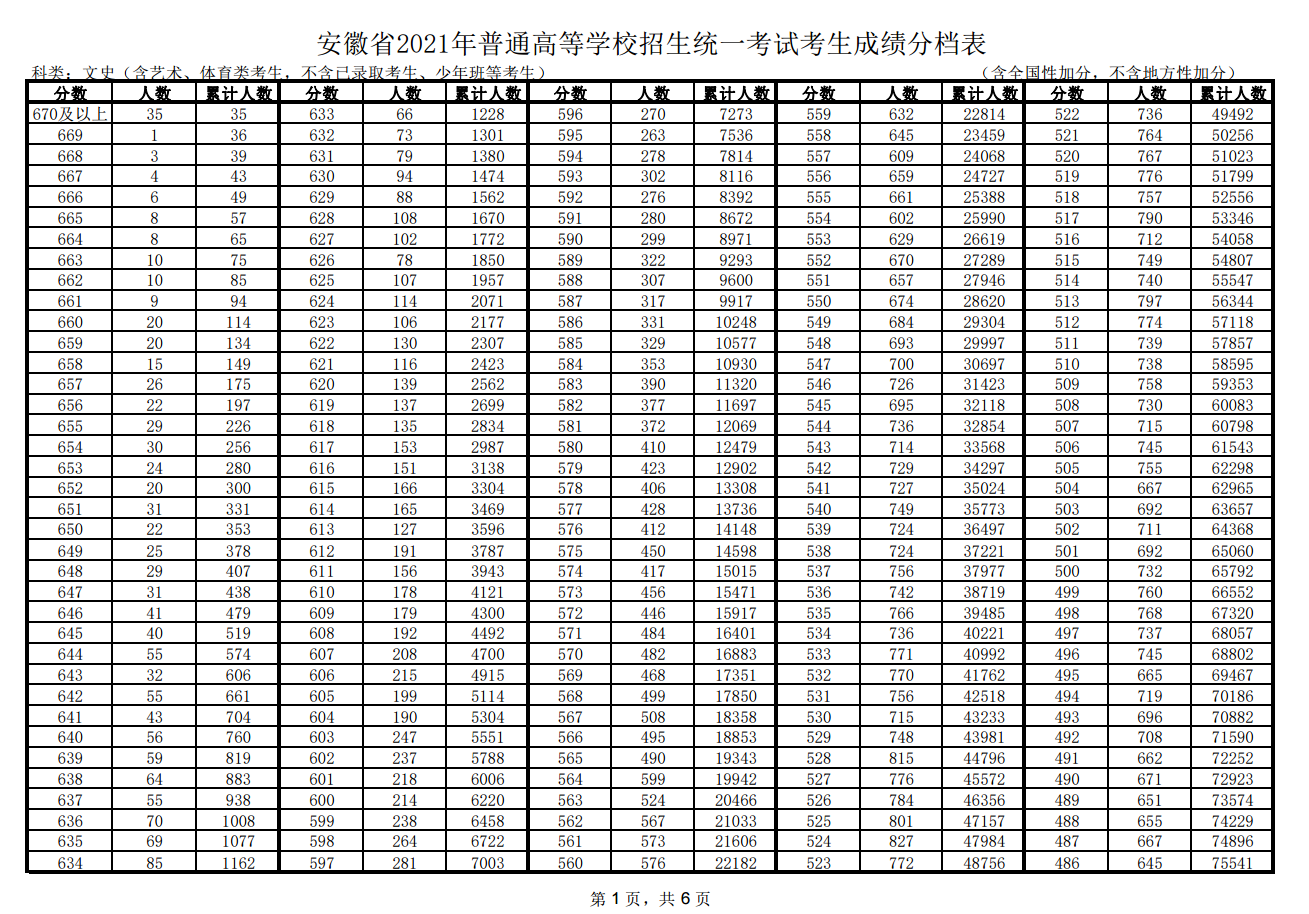 文史类分段表(含艺术、体育类考生,不含已录取考生、少年班等考生)