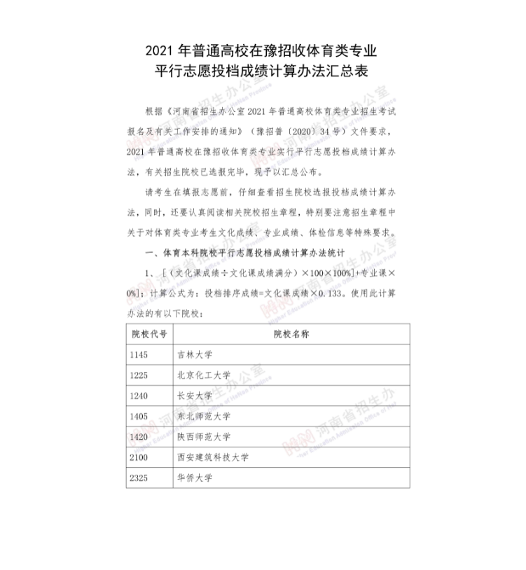 河南:2021年普通高校在豫招收体育类专业平行志愿投档成绩计算办法汇总表