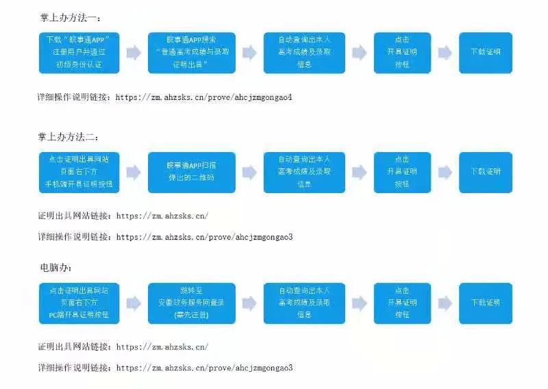 安徽省教育招生考试院为更好服务广大考生,扎实开展“我为群众办实事”实践活动,自2021年7月1日起将《安徽省普通高校招生成绩证明》和《安徽省普通高校招生录取证明》出具方式调整为网上办理。