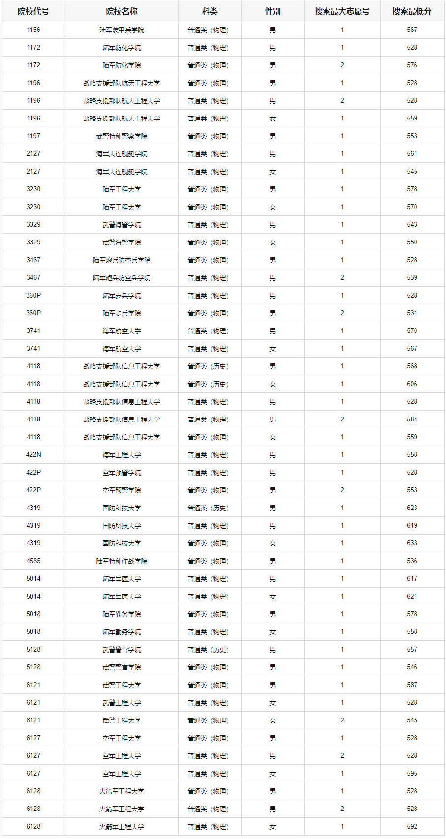说明:根据战〔2021〕172号《关于做好重庆市2021年度军队院校招收普通高中毕业生政治考核、面试和体格检查工作的通知》规定,对符合相关条件且填报有军队院校志愿的考生,按照志愿优先的原则,区分院校、性别、首选科目,依据文化成绩从高到低的顺序,按照在渝招生计划数的3至5倍,在特殊类型资格线上确定参检对象。先搜索一志愿,再搜索二志愿。搜索最大志愿号为1表示一志愿军检生源已经足够,不再搜索二志愿考生,其搜索最低分为一志愿入围考生最低分;搜索最大志愿为2表示一志愿控制线上考生已全部入围,其搜索最低分为二志愿入围
