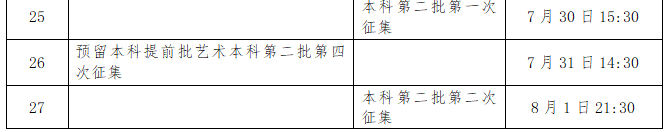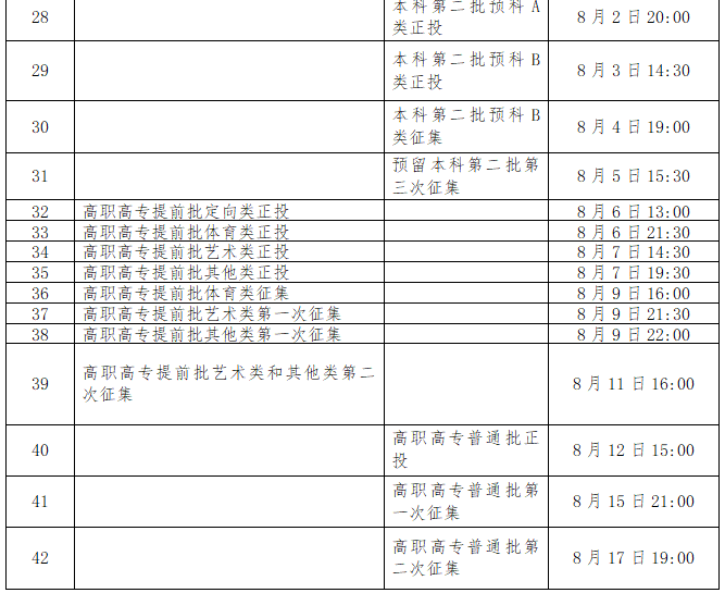 各批次录取开始时间7月5日前强基计划7月6日左右空军、海军、民航招飞7月6日左右本科提前批国家专项、国家优师计划、免费医学定向7月9日左右本科提前批7月14日左右国家专项计划7月16日左右地方专项计划7月17日左右省属高校帮扶专项计划7月20日左右高校专项计划等特殊类型招生录取7月21日左右本科第一批7月22日左右一类模式本科第一批7月23日左右对口招生本科7月26日左右乡村振兴专项计划和省级公费师范生本科7月31日左右本科第二批8月2日左右一类模式本科第二批8月10日左右专科提前批8月11日左右对口招生