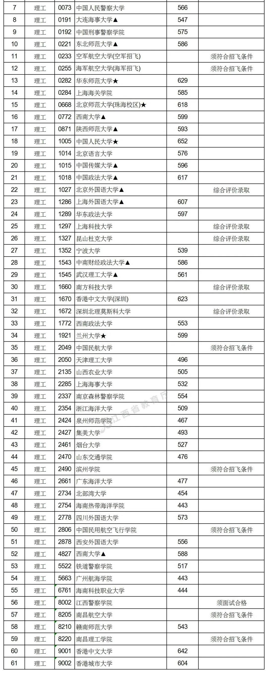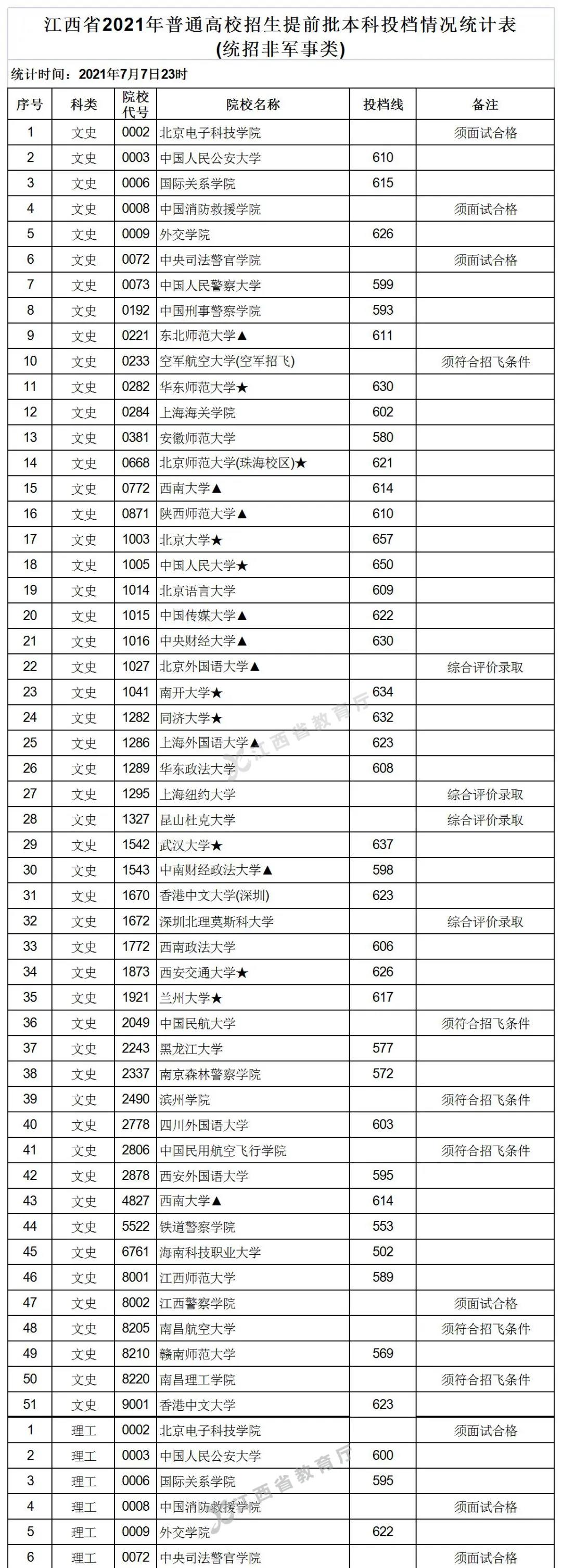 江西省2021年普通高校招生提前批本科投档情况统计表(统招军事类)(统招非军事类)