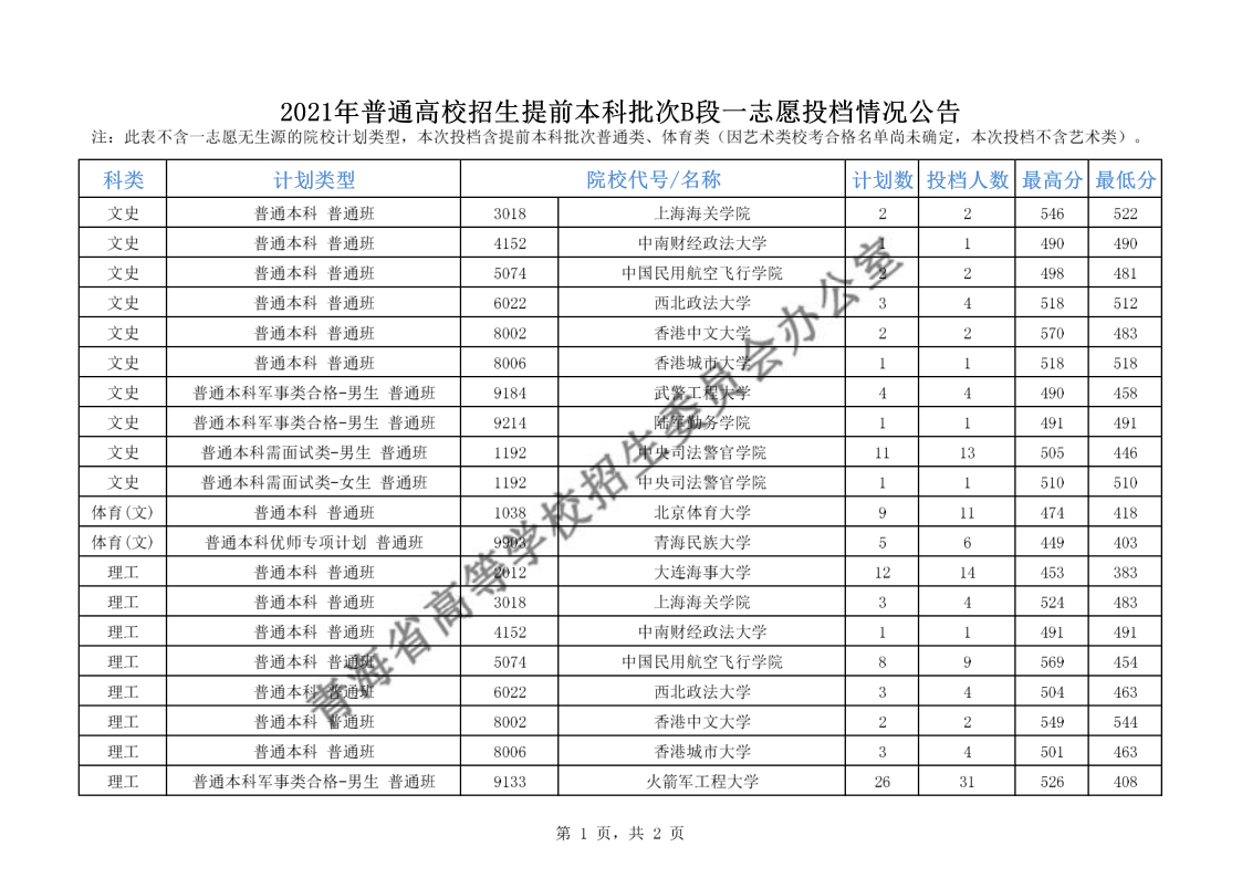青海省2021年普通高校招生提前本科批次B段一志愿投档情况公告