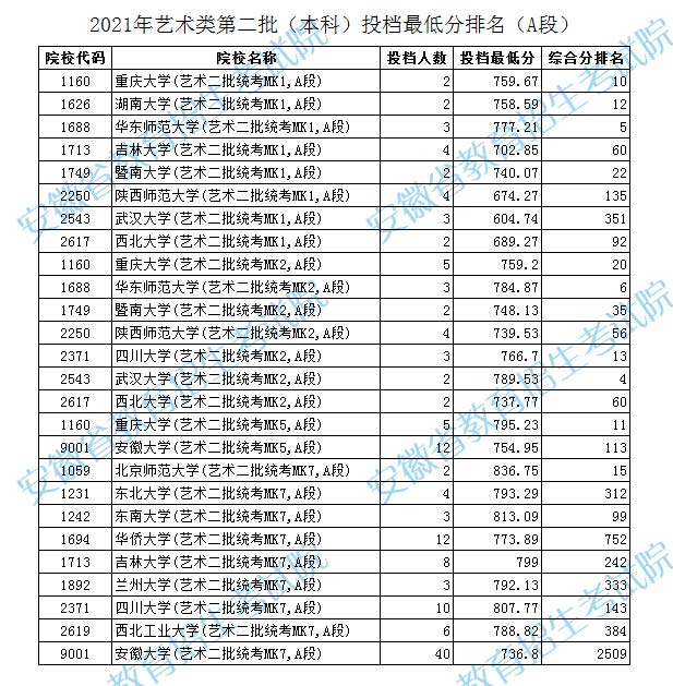 安徽:2021年艺术类第二批(本科)投档最低分排名(A段)