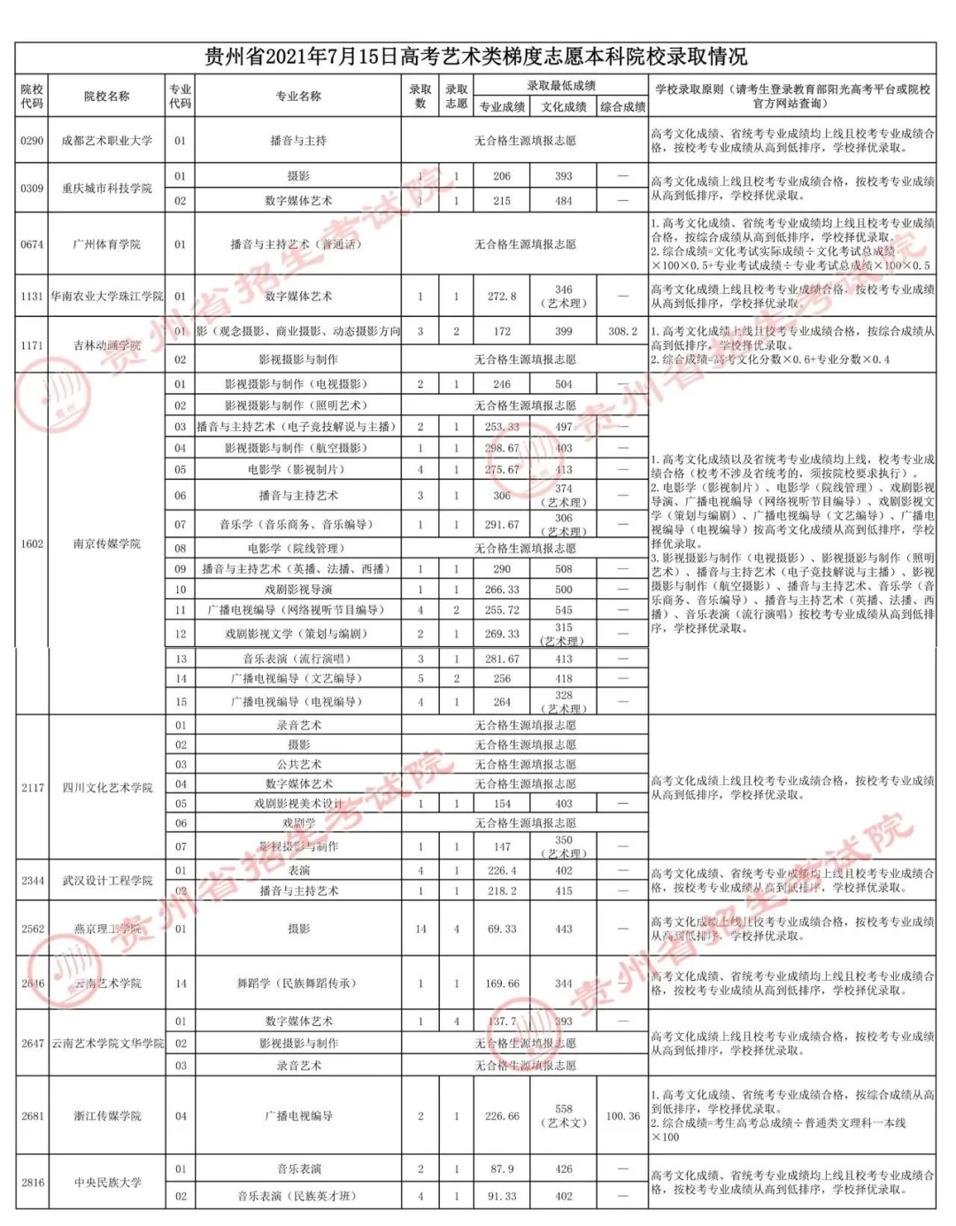 贵州省2021高考艺术类梯度志愿本科院校录取情况: