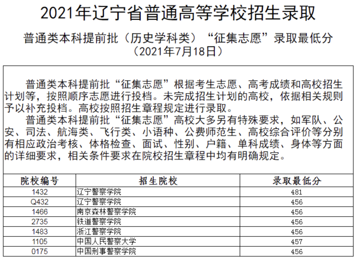 2021年辽宁省普通高等学校招生录取普通类本科提前批(历史学科类)“征集志愿”录取最低分: