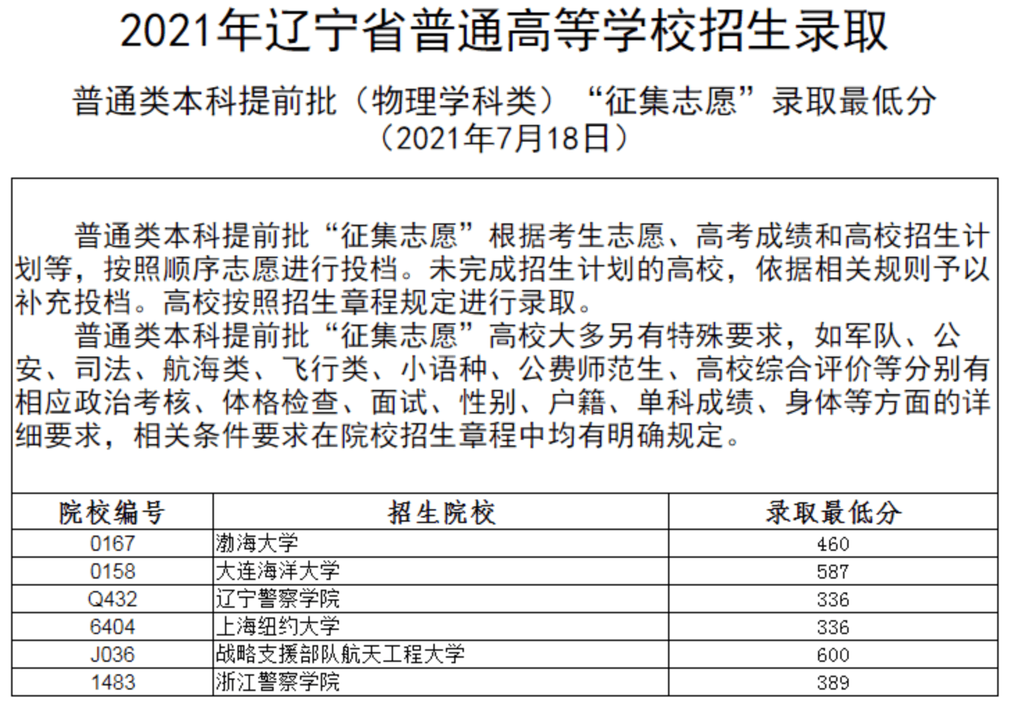 2021年辽宁省普通高等学校招生录取普通类本科提前批(物理学科类)“征集志愿”录取最低分: