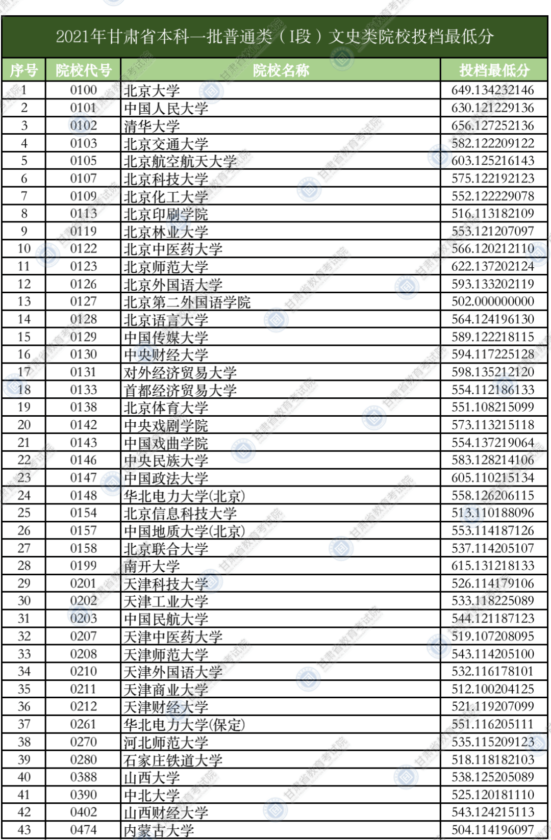 2021年甘肃省普通高校招生录取本科一批普通类(I段)理工类院校、文史类院校投档最低分公布