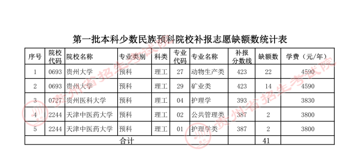 贵州发布关于2021年普通高校招生第一批本科少数民族预科院校网上补报志愿的说明:第一批本科少数民族预科院校平行志愿投档后,理工类部分院校因考生不服从专业调剂退档,尚有缺额,现进行网上补报。考生可根据缺额情况,及时补报志愿。具体要求如下:一、各院校补报分数线按教育部文件(教民〔2005〕7号)“本科预科班录取分数线不得低于在有关省、自治区、直辖市本科相应批次各有关高校提档分数线以下80分”的规定执行,详见附表。二、本次补报设置1个志愿。网上补报志愿时间为7月26日18:00至27日10:00考生凭准考证号和