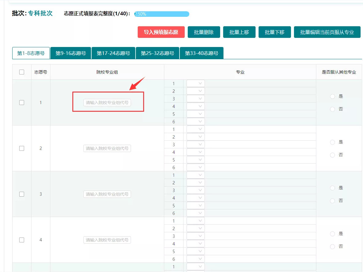 3.对照省教育考试院官网(www.jseea.cn)或“江苏招生考试”微信公众号发布的征求志愿计划,在填报页面手工输入院校专业组代号,并选择专业。