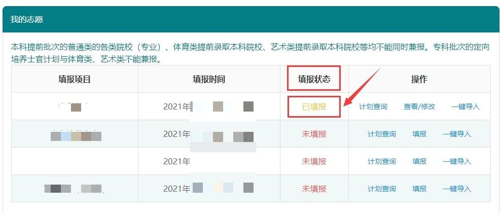 4.考生填报的志愿信息网上提交成功后,志愿即有效。在填报志愿截止时间前,考生可修改自己的志愿信息;填报志愿时间截止后,任何人不得更改考生志愿信息。