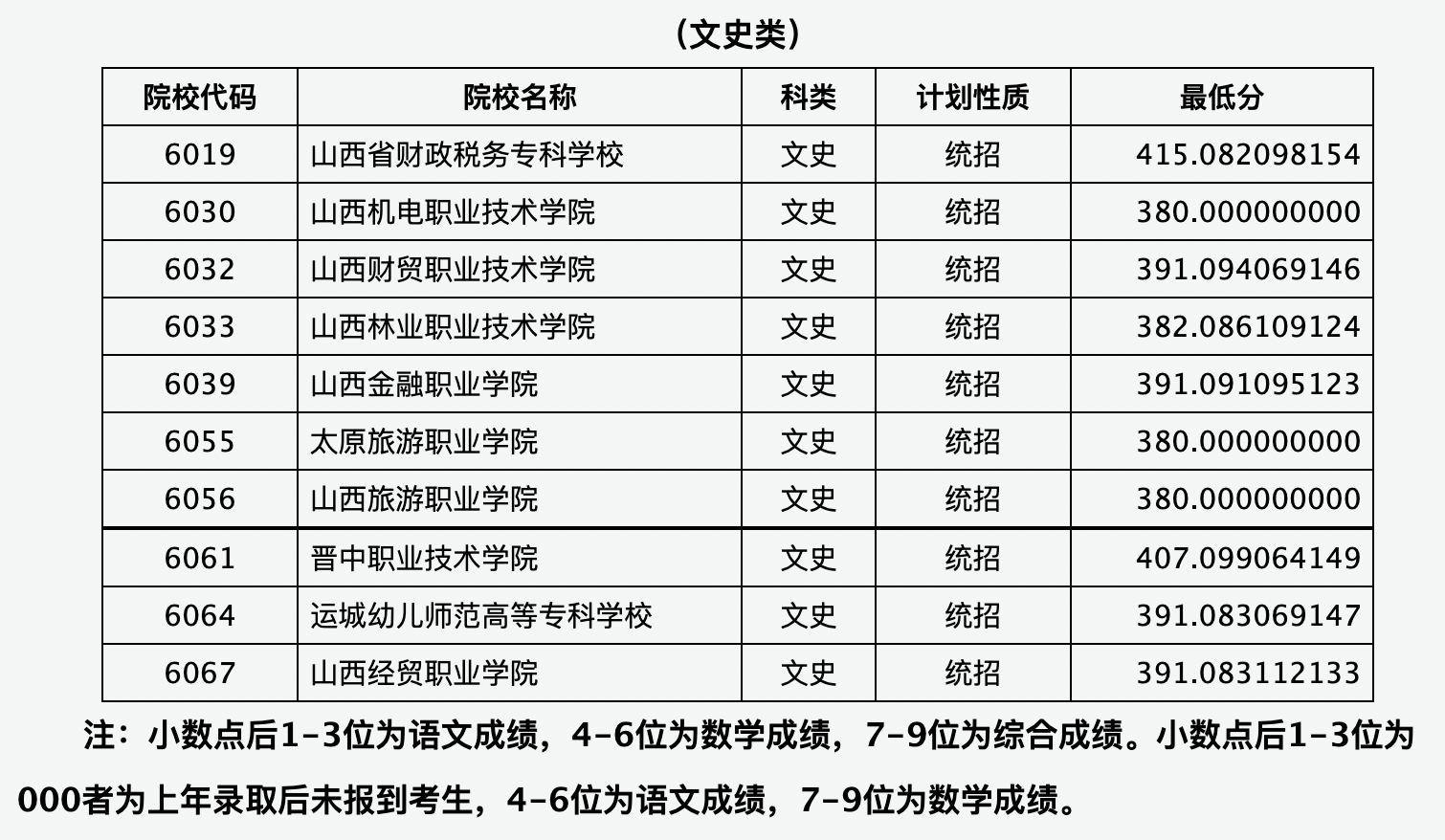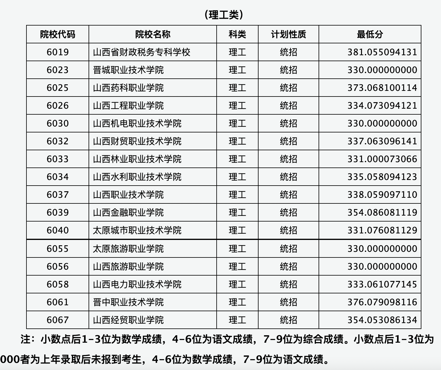 经⼭⻄省招⽣考试委员会批准,我省2021年普通⾼校招⽣⾼本贯通及专科(⾼职)院校录取最低控制分数线划定,现予以公告。⼀、⾼本贯通院校录取最低控制分数线(⼀)⽂史类:380分。(⼆)理⼯类:330分。(三)艺术类1.⽂化成绩最低控制分数线:艺术(⽂)为266分;艺术(理)为231分。2.专业成绩根据考⽣填报志愿情况,按照院校录取原则从⾼到低进⾏录取。⼆、专科(⾼职)院校录取最低控制分数线(⼀)⽂史类:130分。(⼆)理⼯类:130分。(三)艺术类1.⽂化成绩最低控制分数线:艺术(⽂)为91分;艺术(理)为9