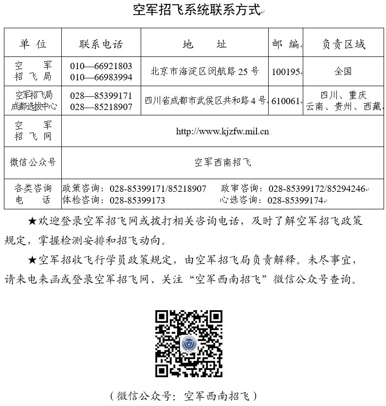 望广大家长积极支持并鼓励孩子报考空军飞行学员!如需了解更多招生资讯,欢迎通过《招生简章》上的联系方式咨询。