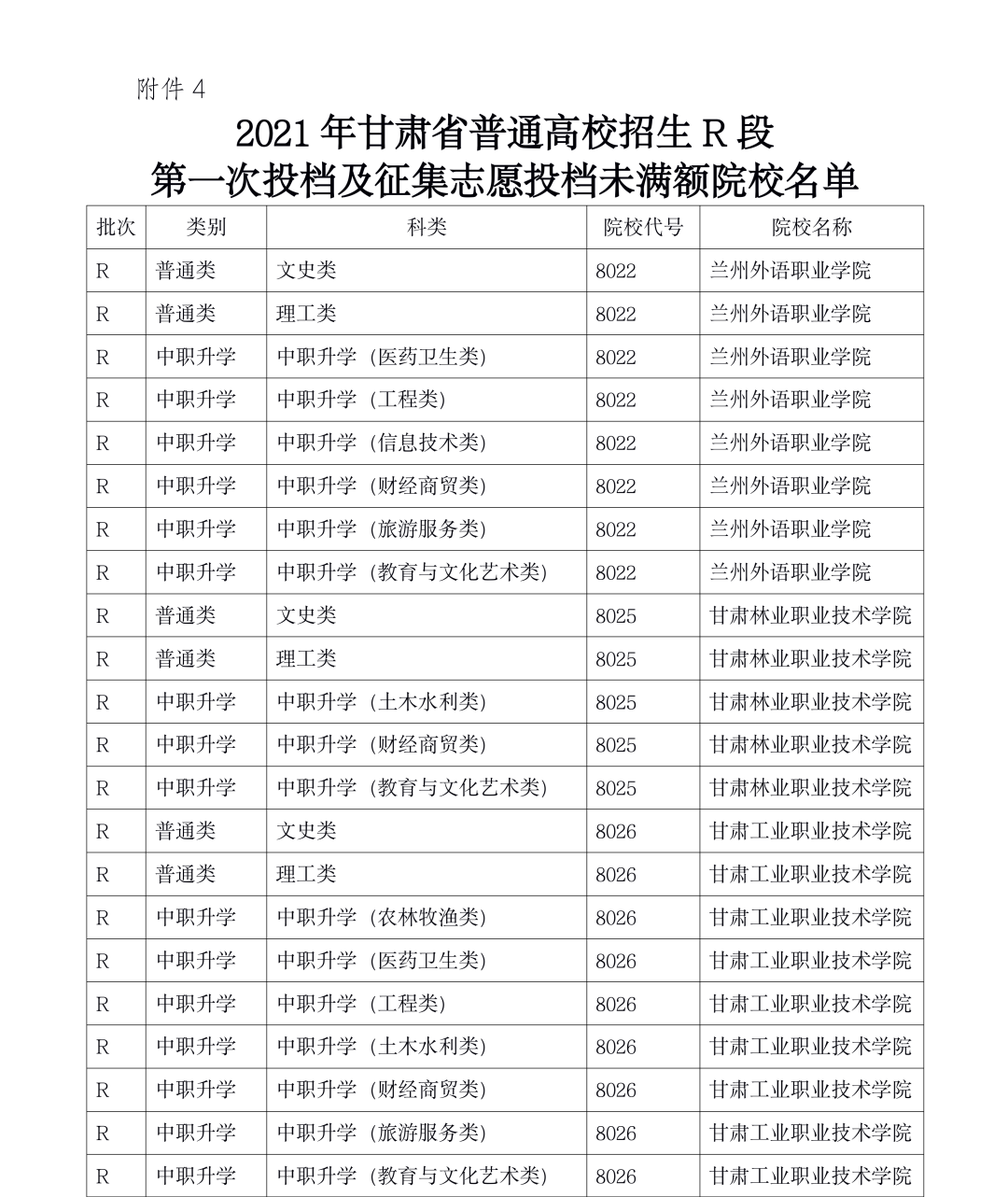 4.2021年甘肃省普通高校招生R段第一次投档及征集志愿投档未满额院校名单
