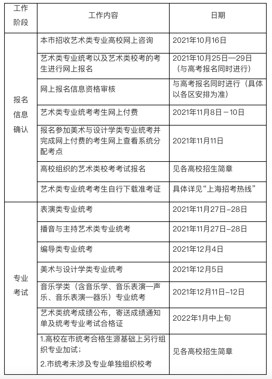 2.2022年上海市普通高校艺术类专业报名考试工作日程表