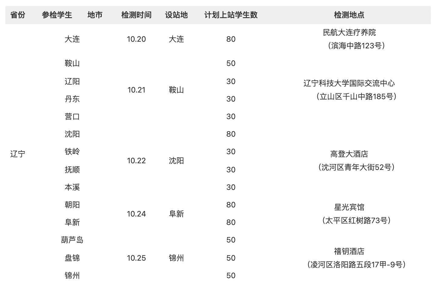 检测一般于当天上午8:00开始,需半天左右;各地市检测地点及日程安排如下: