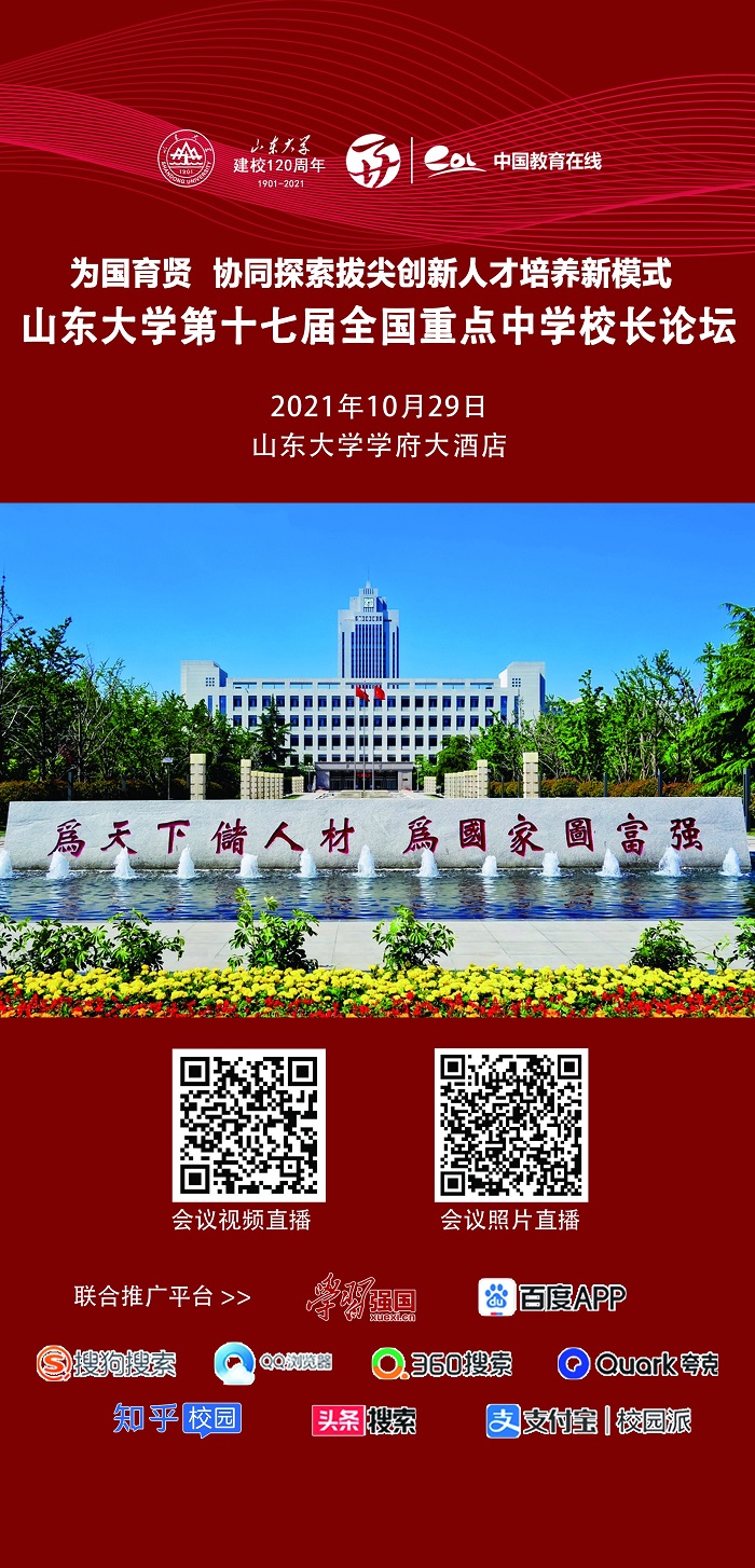 甲子逢双,百廿华诞。2021年是山东大学建校120周年,也是学校坚守“为国育贤”初心,落实立德树人根本任务,致力于培养最优秀本科生取得辉煌成果的一年。为进一步加强与全国重点中学的联系与合作,坚持“四个面向”,共同研讨新形势下拔尖创新人才培养的有效机制和模式,积极推动普高融合,着力培养具有全球胜任力、堪当民族复兴大任的时代新人,山东大学联合中国教育在线定于2021年10月28日-30日举办山东大学第十七届全国重点中学校长论坛。论坛主题:为国育贤,协同探索拔尖创新人才培养新模式论坛地点:山东大学学府大酒店(山