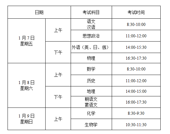 本次合格性考试科目包括:语文(含民族语文、汉语)、数学、外语(含英、日、俄)、思想政治、历史、地理、物理、化学、生物学、共9科。