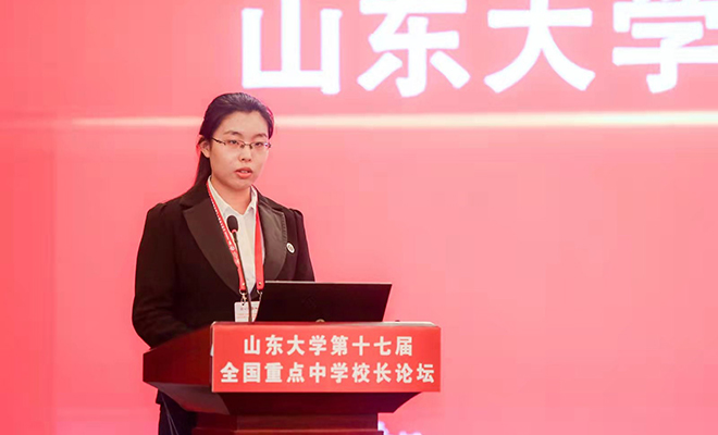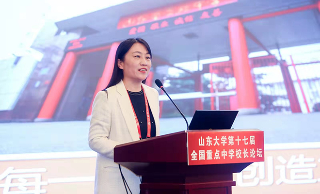山东省实验中学东校区副校长范海沛做了《普高携手育人、培养创新人才》的报告。范海沛就学校育人理念、师资队伍建设、特色课程体系建设,以及普高联合育人模式等向与会嘉宾进行了详细介绍。