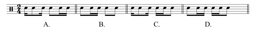 4小节以内的节奏或音乐片段,限于2/4、3/4、3/8三种单拍子,各种常见节奏型及组合。